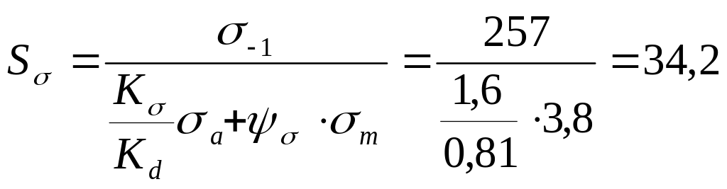 де - = 1,6;– ефективний коефіцієнт концентрації напружень біля шпонкового паза; = 0,81 – коефіцієнт впливу розмірів поперечного перерізу вала; - коефіцієнт чутливості матеріалу вала до асиметрії циклу нормальних напружень