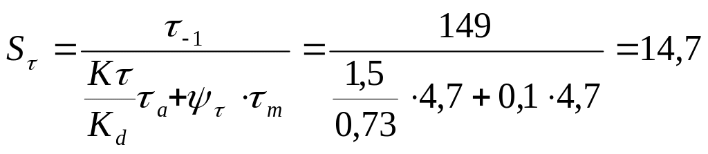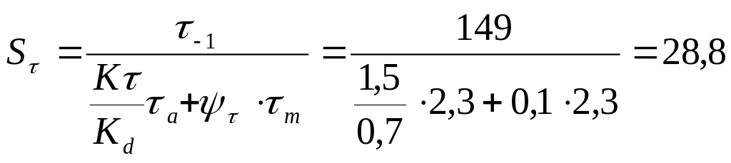 де - = 1,5 – ефективний коефіцієнт концентрації напружень біля шпонкового паза; = 0,7 – коефіцієнт впливу розмірів поперечного перерізу вала; - коефіцієнт чутливості матеріалу вала до асиметрії дотичних напружень; - середні та амплітудні напруження циклу.