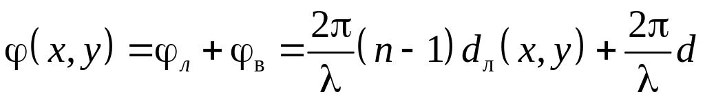 Проведем расчет фазовой задержки , которая складывается из фазовой задержки в толще материала линзы c показателем преломления и фазовой задержки в воздушных промежутках между поверхностями, образующими линзу, и плоскостями и . Толщину линзы, dл (х, у) , в произвольной точке с координатами х и у найдем, рассчитав разность между координатами z правой и левой сферических поверхностей.