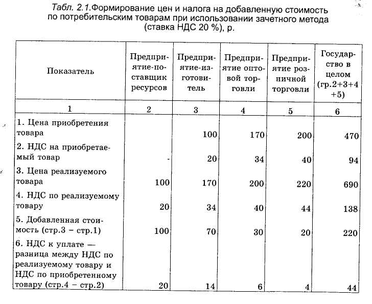 Новый механизм расчета позволяет на каждом этапе продажи облагать налогом не полную выручку от реализации товара, а лишь те ее элементы, которые для данного предприятия составляют добавленную стоимость. Сам же налог собирается в виде последовательных платежей, но его общая сумма оказывается такой же, как если бы налог взимался по установленной ставке только один раз при реализации товара конечному потребителю (табл. 2.1).