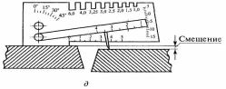 а - общий вид шаблона УШС; б - измерение угла скоса разделки ; в - измерение размера притупления кромки р; г - измерение зазора в соединении а; д - измерение смещения наружных кромок деталей F