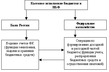 Банк России является важным звеном в системе исполнения бюджетов и государственных внебюджетных фондов. Т.к. процесс исполнения бюджета любого уровня предполагает участие банковской организации. Денежные средства считаются зачисленными в доход бюджета или ВБФ с момента совершения Банком России или кредитной организацией операции по зачислению денежных средств на счет органа, исполняющего бюджет. Департамент организации и исполнения федерального бюджета и ВБФ ЦБ РФ решает следующие задачи: - организует методологическую работу в банковской системе по учету средств бюджетов всех уровней, целевых бюджетных фондов, взаимодействует с МФ РФ государственными ВБФ, бюджетами субъектов РФ и органов местного самоуправления по этим вопросам. - организует в банковской системе кассовое исполнение федерального бюджета и составляет банковскую отчетность о кассовом исполнении федерального бюджета и об остатках средств на счетах местных органов власти и государственных ВБФ; - готовит предложения по формированию единой государственной денежно-кредитной политики в части взаимоотношений Банка России с бюджетами всех уровней. Кассовое исполнение федерального бюджета – организация и осуществление расчетно-кассовых операций, связанных с исполнением федерального бюджета. В территориальных учреждениях ЦБ РФ функционируют управления организации и исполнения ФБ и ВБФ. Кроме вышеуказанных задач они обеспечивают достоверность передаваемых кредитными организациями данных об использовании средств бюджета и ВБФ, а так же осуществляют надзор за исполнением кредитными организациями и РКЦ банковского законодательства в части исполнения бюджетов. Функции территориальных подразделений ЦБ РФ: - контроль за обслуживанием РКЦ счетов по учету доходов и средств ФБ, бюджетов других уровней и ВБФ; - контроль за своевременным и правильным составлением РКЦ и кредитными организациями отчетности по кассовому исполнению бюджетов; - составление и представление ЦБ РФ отчетности по кассовому исполнению ФБ в целом и по региону; - организация и осуществление контроля за правильностью совершения операций по счетам ФБ в период завершения бюджетного года; - контроль за правильностью и своевременностью перечисления поступивших по региону доходов ФБ на финансирование расходов региона, осуществляемых органами казначейства, а так же за перечислением средств с транзитных счетов ВБФ на их основные счета. К бюджетным полномочиям Банка России относятся: - разработка совместно с правительством РФ и представление на рассмотрение в ГД основных направлений развития денежно-кредитной политики; - обслуживание счетов бюджетов; в случае отсутствия учреждения Банка России на территории счета бюджетов обслуживаются кредитными организациями; - осуществление функций генерального агента по государственным ценным бумагам РФ. Роль Федерального Казначейства РФ и Банка России в процессе кассового исполнения бюджета и ВБФ можно охарактеризовать схемой: Кассовое исполнение бюджета может быть возложено на коммерческие банки в следующих случаях: - кредитные организации могут привлекаться для осуществления операций по предоставлению средств бюджета на возвратной основе - кредитные организации могут обслуживать счета бюджетов при отсутствии учреждений Банка Рос