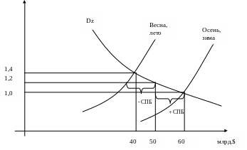Пояснения к графику: начинается продажа зерна => экспортеры получают иностранную валюту осенью, зимой снижается паритет => избыток изымается государством и осуществляется поддержка курса на основе реального паритета. В период весна-лето существует необходимость в импорте, то возникает сокращение суммы валюты; повышение курса => государство продает изъятую валюту => регулирует курс => смена дефицитов и избытков П.Б.