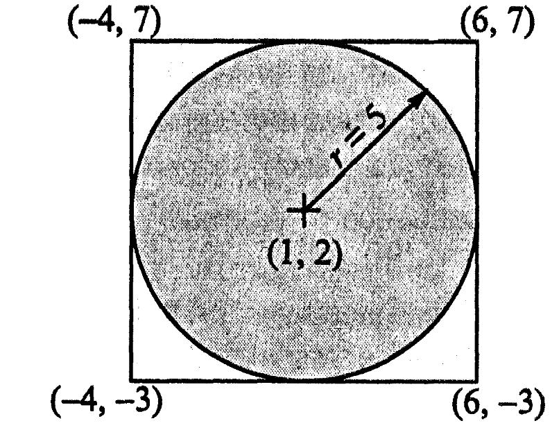Процедура оценки площади требует заключение круга в описанный около него квадрат, сторона которого равна диаметру круга (рисунок 1). Вершины квадрата определяются непосредственно из геометрических свойств фигуры.