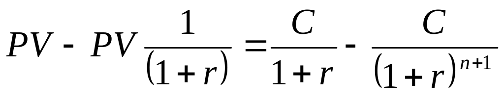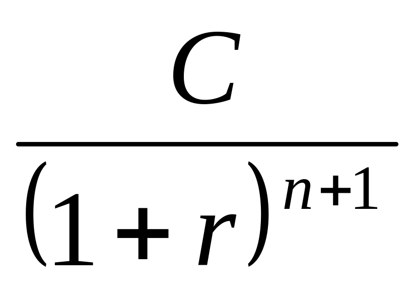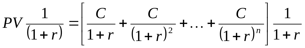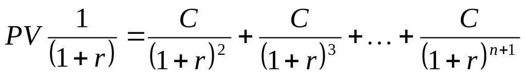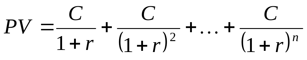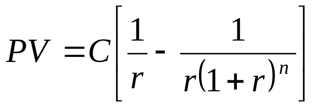 где PV- текущая стоимость аннуитета; С — сумма ежегодного денежного потока; r — ставка дисконтирования; п — число лет аннуитета.