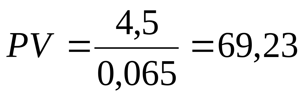 Если годовая доходность, на которую рассчитывает инвестор по государственным ценным бумагам британского правительства, составляет 6,5 %, а по облигациям ежегодно выплачивается 4,5 £, то текущая стоимость облигации составит