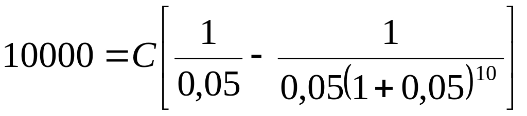 Рассмотрим это на примере. Человек за изобретение получил вознаграждение в размере 10 000 долл. Он не желает эти деньги потратить сразу, а намеревается использовать их в течение 10 лет равными долями. При этом, как разумный инвестор, он хочет, чтобы на неиспользуемую часть денежных средств начислялись определенные проценты. Поэтому он размещает 10 000 долл. на банковском депозите, скажем, под 5 % годовых и предусматривает в условиях договора равномерное получение денежных средств, с тем, чтобы через 10 лет выбрать всю сумму с учетом накопленных процентов. Какую же сумму будет получать инвестор ежегодно? Ее можно вычислить на основе формулы текущей стоимости аннуитета, которая имеет следующий вид: