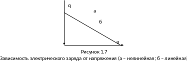 В случае, когда характеристика q(u) прямолинейна, емкость С постоянна (линейная емкость). На рисунке 1.7 показаны нелинейная и линейная зависимости заряда от напряжения. В этом разделе рассматриваются линейные емкости.