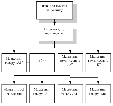 Продуктова (товарна) організація. Компанії, які виробляють велику кількість різних товарів і мають багато торгових марок, часто організуються на основі управління окремими товарами чи торговими марками. Організаційна структура таких компаній, в якій за розробку і реалізацію стратегій і поточних планів маркетингу для конкретного продукту чи групи продуктів відповідає керуючий продуктом (продукт-мєнеджер), у котрого в підпорядкуванні знаходяться співробітники, які виконують усі необхідні для даного продукту функції маркетингу.