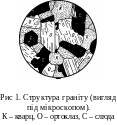 Найбільш розповсюджені глибинні кислі вивержені породи – граніти (структура граніту наведена на рис.1). На другому місці - виливні основні породи – базальти. У табл. 1 наведені основні фізико-механічні властивості розповсюджених гірських порід.