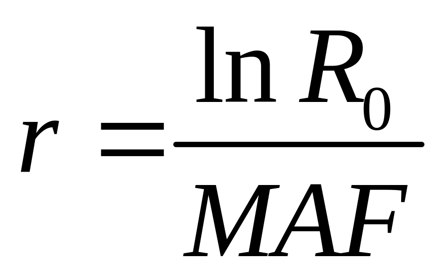 Где L — среднее число живущих женщин в возрасте x по таблице смертности, l0 — корень таблицы смертности. Необходимо помнить, что вычисленный для гипотетического поколения нетто-коэффициент воспроизводства как мера замещения материнского поколения дочерним имеет смысл лишь в рамках модели стабильного населения. Численность такого населения увеличивается (или уменьшается) в R0 раз за время T, равное средней длине поколения. Так, в 2000 г. нетто-коэффициент воспроизводства в Российской Федерации был равен 0,57. Это не означает, что численность населения страны сократится на 43% через 25–30 лет (примерная длина поколения в России). Подобное утверждение верно только для стабильного населения, каковым население России не является.