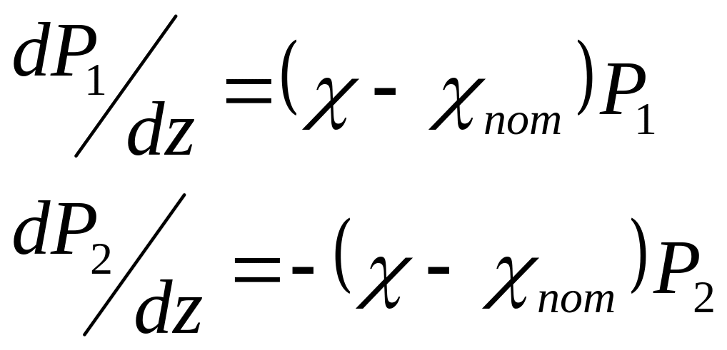 Здесь Р1 и Р2 -- потоки энергии через единицу поверхности поперечного сечения активной среды в единицу времени, распространяющегося от торца 1 к торцу 2 активной среды и в обратном направлении; χ –средний по длине коэффициент усиления активной среды; χпот -- средний по длине коэф вредных потерь. Уравнения переноса дополняются граничными условиями (на торцах активной среды), предполагая, что активная среда занимает весь объем резонатора: