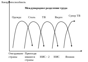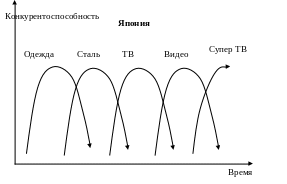 Этот рисунок показывает пример МРТ в рамках «стаи». Как видно из графика, конкурентоспособность в производстве «Супер ТВ» наибольшая у Японии, хотя она и не может производить одежду (конкурентоспособность равна нулю). По мере экономического развития эти страны сдвигаются вправо, слева присоединяются новые страны, Япония же (в нашем случае – лидер стаи) осваивает новые заделы, совершенствуя технологию и производство в целом.