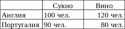 В таблице приведено то количество труда, которое надо затратить(количество человек, труд которых надо затратить) на производство этого количества вина и сукна соответственно.