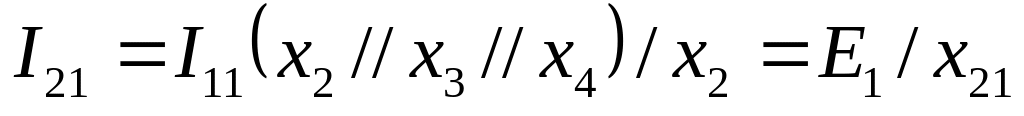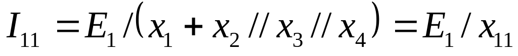 Для вище наведеної схеми заміщення (рисунок 9.6,а) розрахуємо струми КЗ методом накладання, розглядаючи по черзі схеми заміщення з дією ЕРС Е1 , Е2 і Е3 (рисунок 9.7). Припускаємо, що в схемі заміщення на рисунку 9.7,а діє тільки одна ЕРС Е1, а всі інші дорівнюють нулю. Струм у першій вітці, зумовлений дією ЕРС Е1,