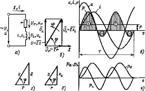 Рис. 2.9. Электрическая цепь, содержащая катушку индуктивности r и L(а), ее векторная диаграмма (б), графики мгновенных значений u, i, р (в), треугольники мощностей и сопротивлений (г, д), графики мгновенных значений рa , pL (e) |
