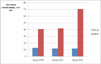 Рис. 2. Показатели легочной вентиляции у студенток 1 курса 2008 года, студенток 1 курса 2011 года и студенток 4 курса 2011 года.