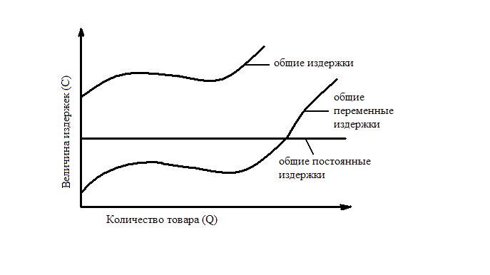 Общие и средние издержки. Сумма постоянных и переменных издержек образует общие, или суммарные, издержки производства. Для фирмы это наименьшие общие денежные затраты, необходимые для производства определенного количества продукции. Суммарные издержки увеличиваются по мере роста количества производимой продукции. Поэтому они являются возрастающей функцией объема выпуска (рис. 4.9).