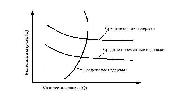 Рис. 4.10 График зависимости предельных издержек от средних общих и средних переменных издержек