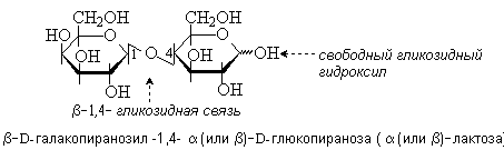Лактоза содержится в молоке (4-5%). Молекула лактозы состоит из остатков D-галактозы и D-глюкозы, связанных b-1,4-гликозидной связью. Лактоза – восстанавливающий дисахарид.