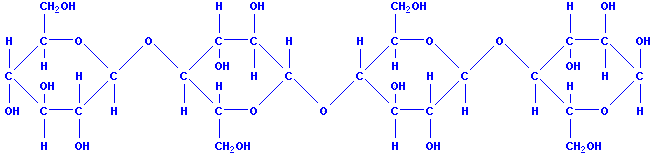 Целлюлоза тоже является природным полимером. Ее макромалекула состоит из многих остатков молекул глюкозы. Белое твердое вещество, нерастворимое в воде, молекула имеет линейное (полимерное) строение, структурная единица — остаток β-глюкозы [С6Н7О2(OH)3]n. Полисахарид, главная составная часть клеточных оболочек всех высших растений.