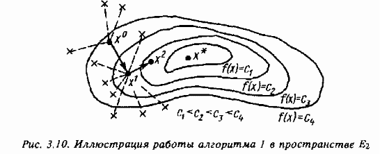 Иллюстрация построения последовательности (3.41) с помощью описанного алгоритма для функции двух переменных приведена на рис. 3.10, где пунктиром показаны неудачные попытки определения хk+1 из (3.41), не приводящие к уменьшению f (х).