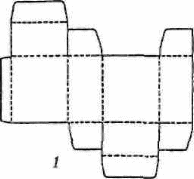 Верхние боковые клапаны 9и 10 совместно с верхней стороной 8 и верхним лицевым клапаном 13 образуют крышку коробки. Крышка может быть приклеенной или многократно открывающейся с фиксацией разнообразными замковыми затворами. Замки выполняются преимущественно на верхнем лицевом клапане 11 в виде вырезов 12, прорезей 13. В них входят и выполняют роль затворов либо верхние боковые кла-паны^и 10, либо язычки 17 на задней стороне ^.Повышают прочность и надежность замков плечи 15 верхнего лицевого клапана. Для удобства сборки крышки верхний лицевой клапан 11 имеет конусную за-ходную часть 14, а в основании верхних боковых клапанов 9н10 вырезаны специальные компенсаторы 16. Если изготовление складной коробки завершается процессом склеивания продольного шва по склеиваемому клапану 5, то складывание (фальцовку) коробки осуществляют по двум линиям биговки 7 или 6.