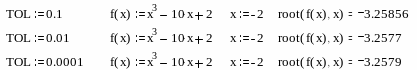 Для изменения точности, с которой функция root ищет корень, нужно изменить значение системной переменной TOL. Если значение TOL увеличивается, функция root будет сходиться быстрее, но ответ будет менее точен. Если значение TOL уменьшается, то функция root будет сходиться медленнее, но ответ будет более точен. Значение TOL можно определить непосредственно в рабочем документе, либо в меню Math – Option . Если два корня расположены близко друг от друга, следует уменьшить TOL, чтобы различить их.