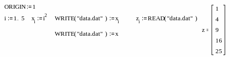 Для работы с внешними данными система MathCAD имеет специальный тип данных – файловые данные. Фактически, это те же вектора и матрицы, но с элементами, которые записываются в виде простых текстовых файлов. Значения элементов считываются последовательно слева направо и сверху вниз и по мере обработки преобразуются в соответствующие им ASCII – коды.