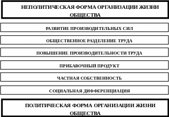 Монолитное единство первобытных обществ оказалась разрушенным. Общество оказалось «расколотым», разделенным по отношению к собственности (имущие и неимущие), по месту в системе властных отношений (управляющие и управляемые), по месту и роли в общественном разделении труда (работники умственного и физического труда; ремесленники, крестьяне, купцы и пр.). Если прежде возникавшие противоречия разрешались на основе кровнородственных связей, обычаев, нравов, традиций, религиозных норм, то в дифференцированном обществе эти механизмы регуляции оказались недостаточными для преодоления конфликта интересов. Объективная потребность в новом регуляторе общественных отношений и вызывает переход от неполитической к политической форме организации жизни общества.