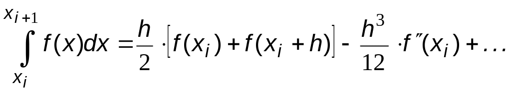 В этом методе подынтегральная функция f(x) на интервале [xi,xi+1] заменяется полиномом первой степени, т.е. наклонной прямой линией. Обычно эта прямая проводится через значения f(x) на границах интервала (рис.6.6). В этом случае приближенное значение частичного интеграла определяется площадью трапеции: