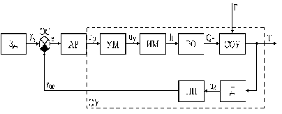 Структурная схема одноконтурной САР промышленным объектом управления приведена на рис. 2.1. Основными элементами ее являются: АР - автоматический регулятор, УМ - усилитель мощности, ИМ - исполнительный механизм, РО - регулируемый орган, СОУ - собственно объект управления, Д - датчик, НП - нормирующий преобразователь, ЗД - задатчик, ЭС - элемент сравнения. Обозначение переменных: Yз- задающий сигнал, e - ошибка регулирования, Up- выходной сигнал регулятора, Uy- управляющее напряжение, h - перемещение регулирующего органа, Qr- расход вещества или энергии, F - возмущающее воздействие, T - регулируемый параметр (например температура), Yос- сигнал обратной связи (выходное напряжение или ток преобразователя).