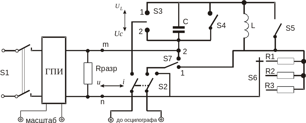 Ємність С, індуктивність L та опори r1, r2, r3 з’єднані послідовно і під’єднані до клем m-n ГПІ. При замиканні ключа S2 вправо, осцилограф, приєднаний до відповідних клем на макеті, вмикається на один з опорів r1, r2, r3. Напруга на опорі пропорційна струму в колі, тому крива струму як функція часу має такий самий вигляд, як і крива напруги. За відомим масштабом напруги і значенням опору можна визначити масштаб струму.