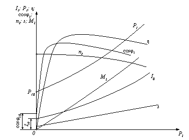 Зависимости n2, s, М2, I1, cosφ1, η и P1 от P2 при U1 = const и f1 = const, называются рабочими характеристиками асинхронного двигателя. Их примерный вид показан на рисунке 1