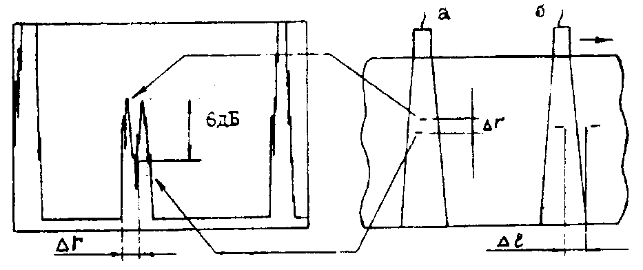 Различают лучевую Dr и фронтальную Dl разрешающие способности. Первая определяется минимальным расстоянием Dr между двумя раздельно выявляемыми дефектами, расположенным в направлении хода луча вдоль акустической оси преобразователя.