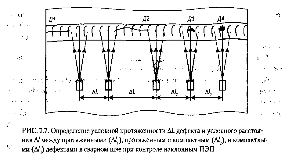 Размеры ΔLд, и ΔХД характеризуются длиной зоны (в мм) перемещения преобразователя между некоторыми крайними положениями, в пределах которого воспринимается эхосигнал от дефекта.