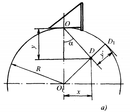 Измерение условной высоты (б) и условной ширины (в) наклонным преобразователем путем сравнения с боковым цилиндрическим отверстием (а);