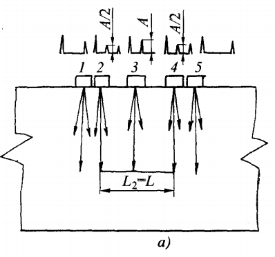 - •Схемы измерения условных размеров дефектов. Погрешности измерения условных размеров. Какие существуют способы задания крайних положений преобразователя при измерении дефектов?