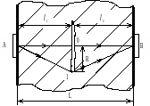 Временной теневой метод основан на измерении времени пробега импульса через изделие. Наличие дефекта при этом определяется по запаздыванию прихода импульса на приемник в точку В (рис.5.6), т.к. расстояние А1В больше чем А0В.