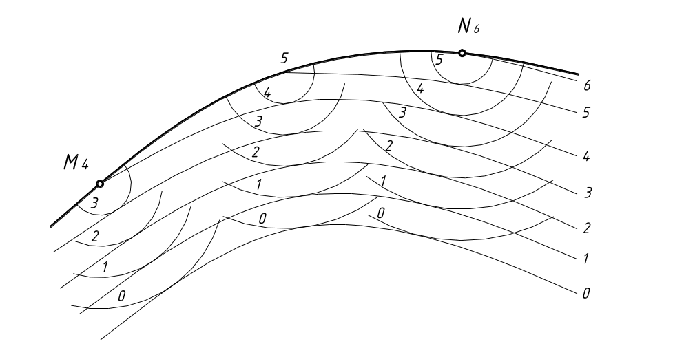 Если прямой круговой конус перемещать так, чтобы его вершина скользила по некоторой направляющей MN , а его ось оставалось перпендикулярной к горизонтальной плоскости, то поверхность, обвертывающая различные положения конуса, будет являться поверхностью одинакового ската (рисунок 21).