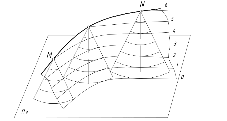 Если задана кривая поверхность, то для ее изображения в проекциях с числовыми отметками прибегают к горизонталям, представляющим собой линии пересечения поверхности плоскостями, параллельными П0 и отстоящими друг от друга на единицу высоты.