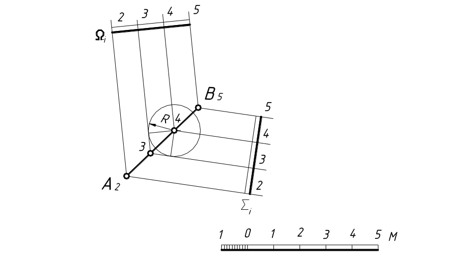Пусть через точку А7, лежащую в плоскости Σi (рисунок 16) требуется провести прямую с заданным уклоном i = 1:2. Для этого из точки А как из центра проведем окружность с радиусом R, равным интервалу прямой заданного уклона.