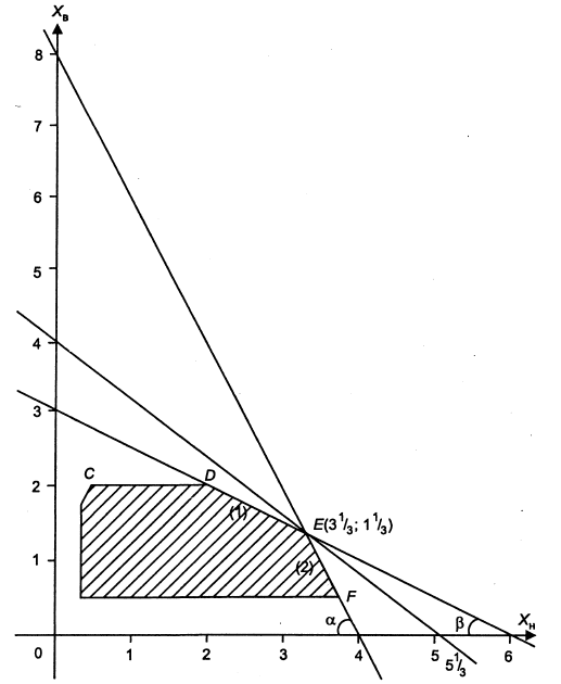 На рис. 2.8.3 видно, что при увеличении запаса этого ресурса прямая (1) перемещается вверх параллельно самой себе, при этом треугольник DКЕ постепенно стягивается в точку К(3, 2). В этом случае областью допустимых решений становится многоугольник ABCKF, а оптимальному решению соответствует точка К, а ограничения (2) и (4) становятся связывающими. В точке К ограничение (1) становится избыточным, поскольку любое дальнейшее увеличение запаса ресурса А не влияет ни на область допустимых решений, ни на оптимальное решение.