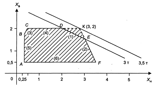 Затем путем подстановки координат точки К(3; 2) в левую часть ограничения (1) определяется максимально допустимый запас ресурса А: