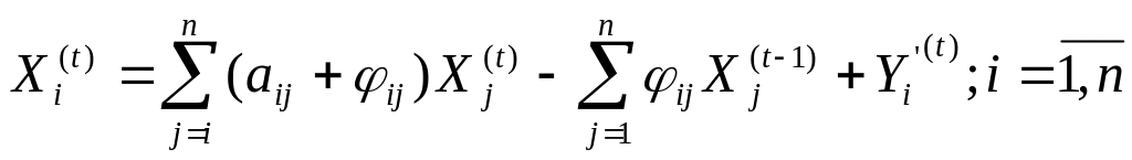 Система (3.29) представляет собой систему линейных разностных уравнений первого порядка. Ее можно привести к обычной системе линейных уравнений, если учесть, что все объемы валовой и конечной продукции относятся к некоторому периоду t, а прирост валовой продукции определен в сравнении с (t-1)-м периодом: