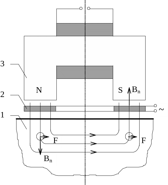 Рассмотрим принцип действия и конструкции ЭМА-преобразователей. В приведенной схеме преобразователь состоит из электромагнита 3 (рисунок 1, а), питаемого постоянным током, и катушки 2, питаемой переменным током. В преобразователе магнитное поле с индукцией Bn в зоне действия вихревых токов расположено по нормали к поверхности изделия. Вихревой ток же в изделии создает катушка 2. Сила F, которая определяет смещение точек cреды, направлена в этом случае по касательной к поверхности, т.е. возбуждаются поперечные акустические волны.