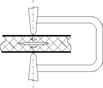 продольных волн, располагая их соосно по обе стороны изделия (рисунок 21). Волна, встречая на своем пути дефект, огибает его и, проходя при этом больший путь, приходит к приемнику колебаний с отставанием по фазе по отношению к волне, прошедшей через бездефектный участок. Мертвая зона в этом случае отсутствует.