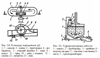Розпушення азбесту – одна із найважливіших операцій при виробництві азбестоцементних матеріалів. Ії метою є збільшення кількості та зменшення товщини волокон для покращення армування азбестом цементного каменю. Розрізняють три види розпушування: сухе, мокре і напівсухе. У всіх випадках азбест розпушують в три стадії. На першій – відбувається обминання азбесту, послаблення зв’язків між його волокнами; на другій – розділення частинок з послабленими зв’язками на найтонші волокна. На першій стадії можна використовувати бігуни або валкові машини; другу стадію здійснюють у вихрових турбулентних потоках рідини (в голендерах, гідророзпушувачах) (рис. 34, 35) або повітря (дезінтеграторах).