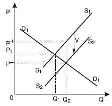Допустим, что введена дотация из госбюджета производителям данного блага размером V р. на каждую единицу. В результате произойдет сдвиг линии предложения вниз на V р., поскольку дотация продавцам будет равнозначна снижению их издержек. Ранее производители были согласны продать объем блага, если цена без дотации будет на V р. ниже P1. В этом случае объем продаж возрастет до Q2, цена для покупателей понижается до Р‑, цена, получаемая производителями, повышается до Р+.