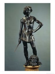 «Верроккьо изобразил Давида оживлённым и задорным юношей, одетым в колет и поножи. Он стоит над громадной головой Голиафа, опираясь на правую ногу и отставив назад левую. В правой руке сжимает короткий меч, левая поставлена на пояс. Во всей фигуре и лице Давида чувствуется торжество юного победителя.